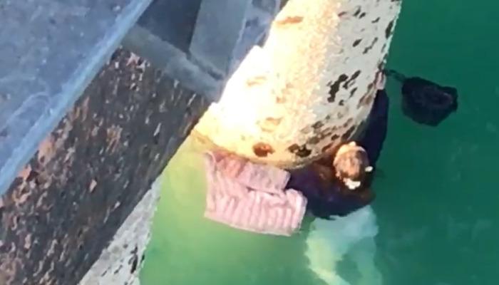 Kadın suya akın etti, köprünün beton ayaklarına yapıştı. Kadın itfaiyeciler tarafından başlatılan Simidi’nin kutusuna yapışamadı. Sualtı polisi kadını kurtardı ve indi.